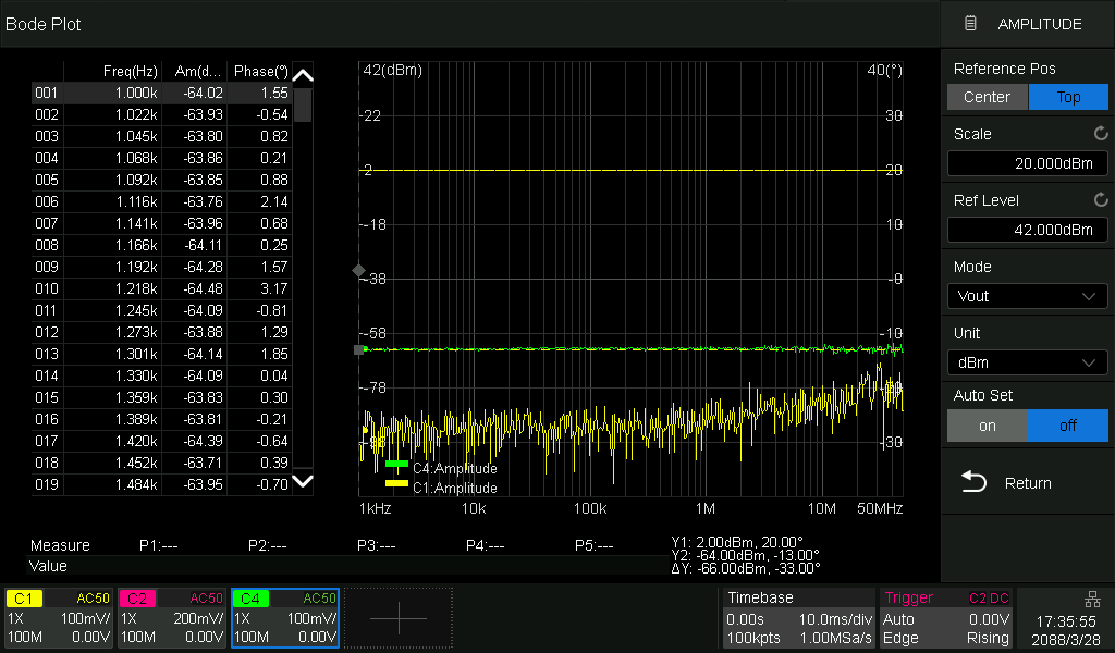 Tuolla tasolla Bode Plot on tietenkin säätänyt tulon 500µV/div